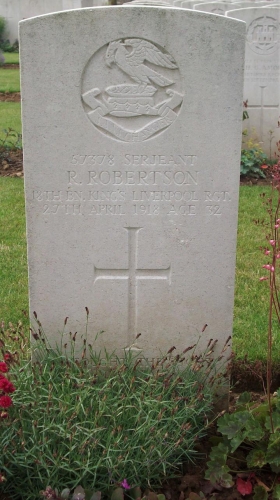 “On the 27th April, 1918, died from wounds (as prisoner of war) in the Field Hospital at Cugny, France, Sergeant Robert Robertson, 18th King’s Liverpool Regiment, aged 32 years, eldest son of Robert Robertson, 15 Byers Road, Partick, and beloved husband of Nicholas M’Caig, 43 Alpine Street, Dalbeattie. - Buried in the Cemetery of Honour, Cugny, France.”