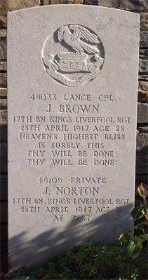 John was living in Pendleton, Manchester when he enlisted in Salford, joining the Lancashire Fusiliers as Private 35081. He was transferred to the 17th Battalion, The King's Liverpool Regiment and was serving as Lance Corporal 49033 when he was killed in action on 28th April 1917, aged 28.