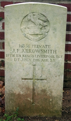 John enlisted at St George's Hall in Liverpool on 02nd September 1914 joining the 18th Battalion as Private 16350 and giving his age as 22 years 61 days, his birthplace as Runcorn and his occupation as clerk. He is described as being five feet eight inches tall, weighed 119lbs with fresh complexion, hazel eyes and brown hair. He stated his religion as Church of England. He gave his next of kin as his sister, Edith Maud Arrowsmith of 40 Somerset Cottages, New Silksworth, Sunderland.