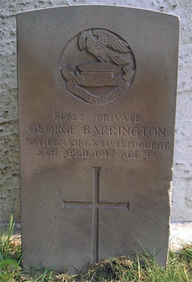 There are crew records in 1908 for a G. Barrington aged 35, an assistant steward, living at 22 Atwill Street, Everton. It is likely that George was away at sea for some years as there is no trace on the 1911 Census records of him anywhere in the UK.