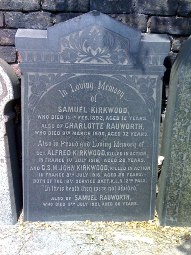 SGT ALFRED KIRKWOOD KILLED IN ACTION IN FRANCE 1ST JULY 1916, AGED 28 YEARS.
