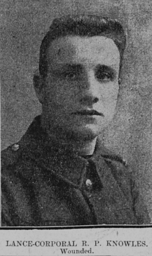 “Lance-Corporal Robert Parr Knowles of the King’s Liverpool Regiment, son of Mr. W. Knowles, 14, Hewitt Street, has been officially reported as having been wounded on July 30th. No details have been received.