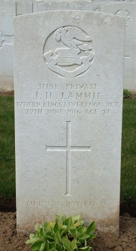 LAMMIE - In loving memory of Private J.H. Lammie (Bert) K.L.R., killed in action, June 27th, 1916. The dearly loved eldest son of Mr and Mrs John Lammie, late 21 Prospect Vale (Fairfield).