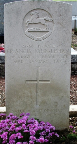 “January 23 1916: In loving memory of Private Francis John Lehan, King’s (Liverpool) Regiment, who lost his life in France, aged 24 years.