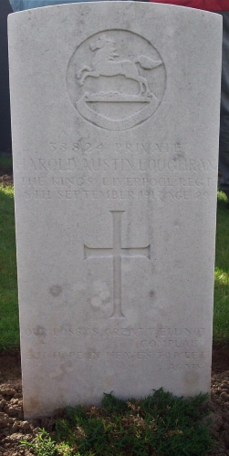 Harold Austin Loughran was born 25th December 1888 at Liverpool and was baptised on 03rd February 1889 at St Anne's Church, Overbury Street, Liverpool. He was the son of William Loughran and his wife Elizabeth (nee Swift), of 5 Durning Road, Edge Hill, Liverpool.