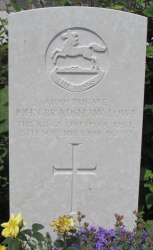 "Son of Mr. and Mrs. J. B. Lowe, Cagthorpe, Horncastle, died of influenza at Second Australian General Hospital, France, leaves wife + 1' Jack was the son of John Bradshaw and Rebecca Lowe. He was living and working in Hucknall, Nottinghamshire in 1916 when he married Milly Hartshorne. They had a daughter Mary (born in 1917). He enlisted with the Nottinghamshire and Derbyshire Regiment, but was transferred to the Liverpool Regiment. He died of influenza at the 2nd Australian General Hospital at Boulogne, France".