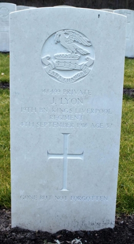 ICRC records for John Lyon, 48499, B Coy, KLR, confirm he was taken prisoner 22nd March 1918 at St Quentin, date of birth 27th January 1881, his address was 17 Duoro Place, Edge Hill.