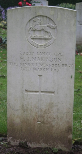 “March 14, killed in action, Lance-Corporal Harry Makinson, the dearly-beloved brother of Mr. and Mrs. W. Makinson, 3, Olivedale Road, Moseley Hill, Liverpool.”