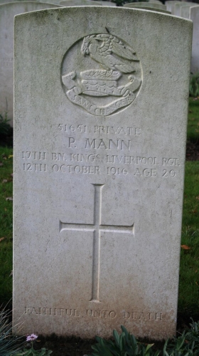 Mann – October 12, 1916, killed in action, previously reported missing, aged 29 years, Rifleman Percy Mann (K.L.R.), the dearly beloved second son of David and Elizabeth Mann, 13 Denton Grove, Anfield.