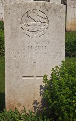 BELL-- In sad but loving memory of Private Cyril Bell (K.L.R.) killed in action May 12, 1916, the dearly-beloved youngest son of Mr. and Mrs. J. C. Bell. 7, Bingley road, Anfield.