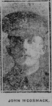Mrs. Annie McCormack, of 8, Shafetsbury-road, Great Crosby, widow of the late C.McCormack, of H.M.Navy, has suffered a double bereavement, her two sons, Harry, and John, having recently fallen in action. Both were privates in the King's (Liverpool Regiment), Harry, who was in his 24th year and was killed in action in France on March 19th, was previously employed at Threlfall's, and John, aged 22, died from wounds received in action on May 3rd, was a member of John Hughes's office staff.
