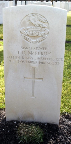 James Daniel was born in Bootle on 03rd July 1896 and baptised on 05th July 1896 at St Winifred's R. C. Church, Bootle. He was the son of James McElroy and his wife Annabella (nee Teer) who were marred 28th July 1894 at St John the Evangelist RC, Liverpool. His father was born in Dublin, and his mother in Liverpool. They had five children, of which James was the eldest. He had siblings Marcus, born in 1897, Robert Burke 1899, Annabella 1901, and Emma Elizabeth 1902.