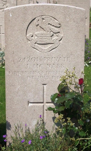 “Official news has been received of the death in action of Private John McNabb, of the “Pals.” He was twenty-one years of age, and resided with his mother at 41, Greeta-street, Liverpool.”