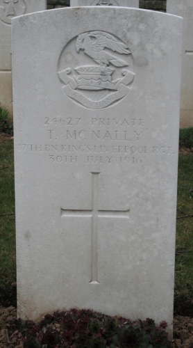 Thomas McNally was born in Liverpool on 05th April 1886, the son of William McNally and his wife Jane (née Penlington). His father, from Carrick, Monaghan, Ireland, and his mother, born in Liverpool, married on the 30th Dec 1866 at Our Lady of Immaculate Conception, Everton, and had ten children. Thomas had older siblings Mary, Jane, Cecelia (who died at age 12), Patrick, Maria (died in infancy), William, and Maria, and younger siblings Henry (died in infancy) and Gerald. Thomas was baptised on 25th April 1886, in St. John’s Roman Catholic Church, Liverpool, his parents’ residence given as 3 Hailley(?) Bodley Street.