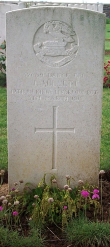 There is no direct evidence to identify this soldier (records giving next of kin, newspaper notices, etc.). SDGW shows James Millett was born in Oldham, Lancashire. There are two births of this name in Oldham between 1870 and 1900: in September quarter 1882 and December quarter 1899. The latter appears to have died in 1976 so if Oldham is the correct birthplace, then this soldier was born in 1882, the son of Jacob Millett and Frances (née Mills), who married in 1871. James was baptised in St. Mary’s, Oldham, on 13th September 1882, his parents’ residence given as Belmont Street and his father’s occupation as carpenter. Another son, Joseph, was born in 1884 but died in infancy, leaving James as their only surviving child.