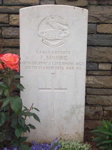 There are now over 850, 1914-18 war casualties commemorated in this site. Of these, more than half are unidentified. Memorials are erected in the cemetery to 68 soldiers (chiefly of the 19th King's Liverpools and the 17th Manchesters), buried by the Germans in their cemetery on the St. Quentin-Roupy road, whose graves were destroyed by shell fire.