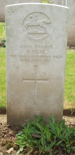 Decimus Neal originally enlisted into the Manchester Regiment as Private 1871. He was transferred to the 19th Battalion of The King's Liverpool Regiment as Private 52099. He died of wounds on 12th April 1917, aged 23.