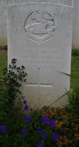 "Eldest son of the late Mr. Theodore Neame and Mrs Neame of 6 Mersey View, Blundellsands. Private Neame died on June 21st in the trenches from a shell. Although only 17 and a half years of age, nothing would keep him back and on the first day of recruiting for the "Pals" he, in the company of others from his office (the Union Marine Insurance Company) were among the first to enlist. He trained at Knowsley, Grantham and Salisbury Plain before accompanying the "Pals" to France in Christmas 1915 where he remained".