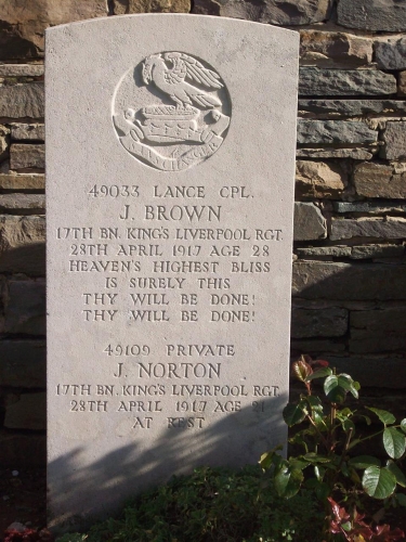 He now rests at Cherisy Road East Cemetery, Heninel, France at Plot 30. He shares his headstone with Lance Corporal 49033 John Brown of the 17th Battalion who was also killed in action on 28th April 1917 and rests at Plot 29.
