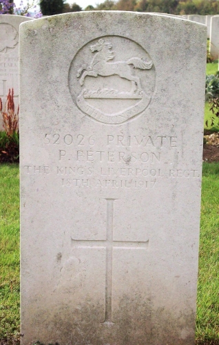 Peter was born in the summer of 1888 in Toxteth Park, Liverpool the son of Peter Peterson and his wife Ursula (nee Johnston) both of whom were born and married in the Shetland Isles. His older brother John was also born in Shetland, and by 1879 the family had moved to Liverpool. Peter was the youngest of five surviving children; brothers John and James and sisters Jessie and Ursula (May/Mary).