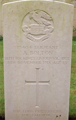 BOLTON - In sad but loving memory of Sergeant ANTHONY BOLTON, 18th L.H.Y., the dearly loved eldest son of John and M. A. Bolton of Rough Lane, Kirkby, Liverpool, killed in action France, November 8th 1918, aged 23 years.