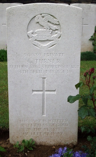 George was born in late 1898 in Westhoughton, Lancashire he son of Thomas Turner and his wife Ellen (nee Hall).His father was born in Westhoughton and his mother in Wigan; they married in 1898. George was the eldest of five children; he had three brothers and one sister: Edwin, Catherine, Thomas, and John.