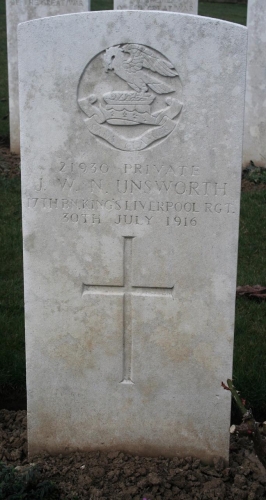 James Walters Noel Unsworth was born on 26th December 1895 at Liverpool, the son of Arthur Unsworth and his wife Theresa Charlotte (nee Cross). Her father, Pierre Jean Baptiste Hippolite Auguste Cros, was a French merchant who married and settled in Liverpool. James was baptised on 16th February 1896 at St John the Divine, C. of E. Church, Fairfield, Liverpool, his parents’ residence given as 20 Prescot Drive, and his father’s occupation metal merchant. His birth was registered as James Walters, and he was baptised James Walters Noel. His parents married on the 06th December 1893 at St James' Church, West Derby. Arthur was a 33 year old merchant of 70 Moscow Drive, father James deceased , whilst Theresa was aged 25 of 29 Derby Lane, father Auguste Cros deceased. They had seven children, one of whom, Marjorie Sarah, born in 1899, died in infancy. James had an elder sister Dorothy Charlotte, and younger siblings Harold Auguste, Margery, Arthur, and Gwyneth Mary.