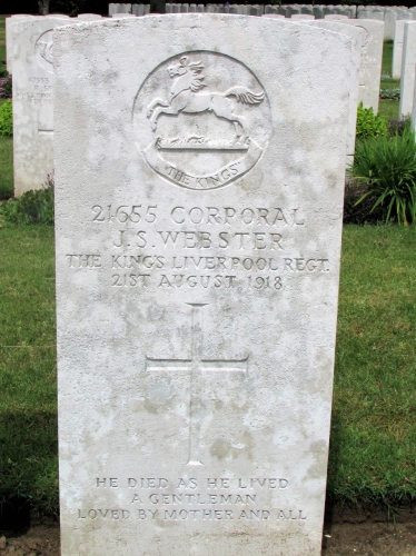 WEBSTER - August 21, at military hospital of pneumonia, Sgt John Webster (Jack), K.L.R., the dearly beloved youngest son of John and Elizabeth Ann Webster, 11 Upper Parliament Street, Liverpool