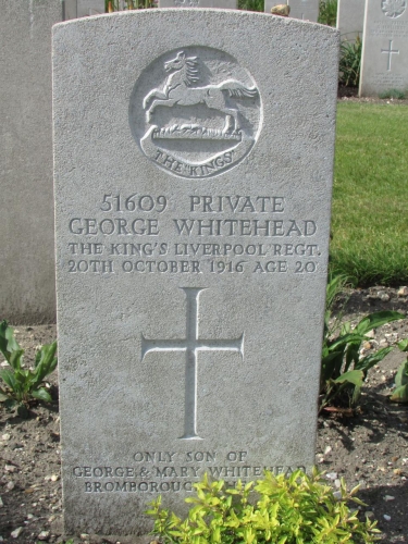 Private George Whitehead, King's (Liverpool Regiment), whose death from wounds is announced, was the only son of Major George Whitehead V.D.[Volunteer Officer Decoration], the principal partner in the well-known firm of Messrs. Thomas Whitehead and Sons, Auctioneers & C., of this city. Private Whitehead, who was 20 years of age, was seriously wounded in the trenches in France on the 12th inst., by a shell which shattered his right leg. The limb was amputated on the 18th, but on the 20th he died of heart failure. He was educated at the Liverpool Institute, and for some years was a member of its Cadet Corps. Major Whitehead is a present one of the commandants at the Aliens' Camp, Knockaloe, Isle of Man.