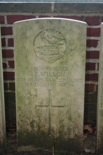 “July 1, killed in action, aged 36 years, Private John Wilson, “Pals”, dearly beloved younger son of John and the late Mary W. Wilson, 54 Carter Street, Liverpool. Deeply mourned by Father, Sisters, and Brother”
