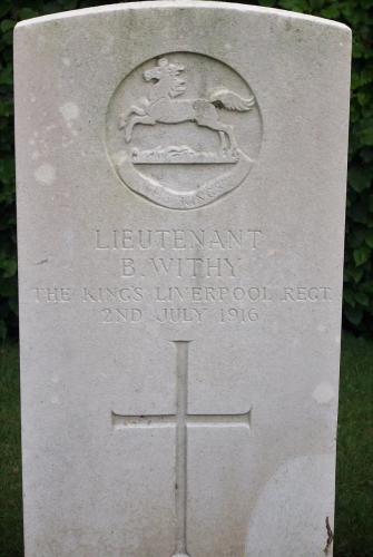He took part in the fighting on the opening day of the Battle of the Somme, 01st July 1916, when his Battalion’s objectives were to capture the German front and support trenches and the German heavily fortified position known as the Glatz Redoubt to enable the capture of the village of Montauban. The trenches were quickly taken but the attack on the Glatz Redoubt was held up by a concealed machine gun position, rifle fire and grenades, with many casualties on both sides. Basil Withy was fatally wounded in the abdomen and left hand, in action with No 4 Company and admitted to 96 Field Ambulance. He died from the effects of his wounds in 21 Casualty Clearing Station (Corbie) the following day, 02nd July.