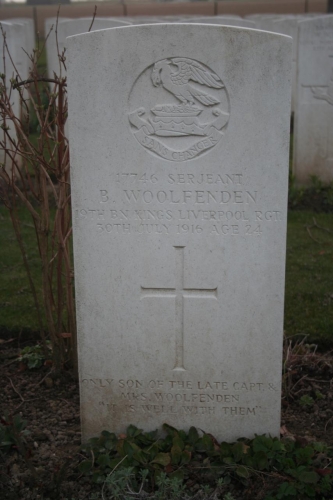 “October 27, In loving and affectionate birthday remembrance of my dear and only brother, Sergeant Ben Woolfenden, K.L.R., who fell in action July 30, 1916. (Ever fondly remembered by his Sister and Brother-in-law May and Willie Fabian.) - 202 Warbreck Moor, Aintree.”