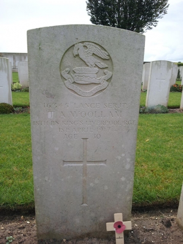 “We regret to learn that unofficial news has been received that Sergt. Thomas Albert Woollam (Liverpool Regiment) was killed in action on April 1st. Sergt. Woollam was the son of Mr. and Mrs. Thomas Woollam of Morton House, Tarvin Road. The Sergeant joined the Army in September, 1914, and went abroad about 18 months ago. He was in the fighting last year and escaped injury. Previous to joining the Army he was engaged in the ironmongery trade in Manchester, having served his time with Mr. Newman, of Chester. Sergt. Woollam was married and was 30 years of age. His brother, A. J. [Herbert] Woollam, was his constant companion through the time he was in the Army, the brothers being in the same regiment. Mr. A. J. Woollam hurt his hand while at the Front and was recently transferred to a hospital in England. Another son of Mr. Woollam is serving as a captain in the British Expeditionary Force, and has been out 18 months.”