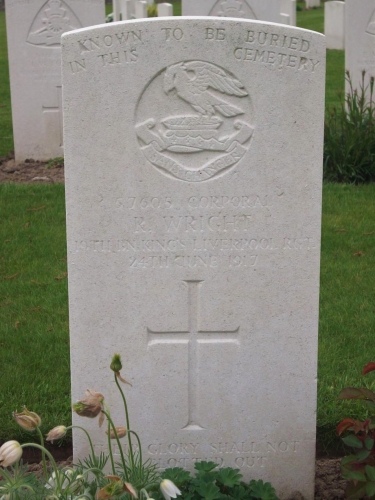 “Died of Wounds. Mrs. and Mrs. S. Dredge, of 10 Burn Street, Golden Square, have received word from England that their only grandson, Bertie Wright, only son of William Ripley Wright and the late Carrie Wright, late of Bendigo, was wounded in France and later died of wounds on June 24, 1917, in the isolation hospital, Thornton, England, aged 20 years. Corporal Wright was attached to the King’s Liverpool Regiment. He was a native of Golden Square and was only three years of age when his aunt, Miss Amy Wright, took him to England, where he resided till the time of enlisting with his regiment. He has done his duty well, and died for freedom’s cause and empire.”