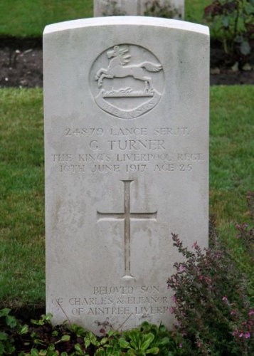 “June 10, who died of wounds whilst prisoner of war in Germany, aged 26 years, Lance-Sergeant George Robert Turner (K.L.R.), the dearly-beloved second son of Charles and Eleanor Turner, 26 Poulter Road, Aintree, and grandson of the late Capt. Robert Graham and Mrs. Graham, of this city.