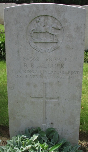 Richard Berry Alcock was born in Liverpool in 1888 the son of Samuel Robert Alcock and his wife Sarah Ann (nee Berry) who married at Great Homer Street Chapel on 06th July 1877. He was the 7th of 11 children his known siblings being; Frederick, Miriam, Bertha (died in infancy) Samuel, William (died in infancy) George, William, Edith and Charles.
