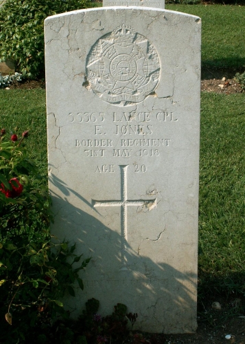 “May 31, aged 20 years, Lce-Corpl. Edward Jones (Eddie), Border Regt., formerly K.L.R., the beloved son of Mr. and Mrs. Jones, 49, Arundel Street, Walton. (Wears a crown of victory.)”