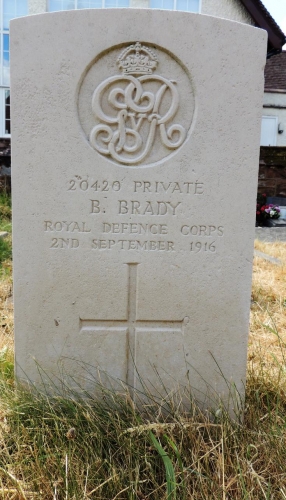 Bernard now rests beneath a CWGC military headstone featuring the Royal Defence Corps badge at Wribbenhall, All Saints Churchyard near Bewdley. Worcestershire.We currently have no further information on Bernard Brady, If you have or know someone who may be able to add to the history of this soldier, please contact us.