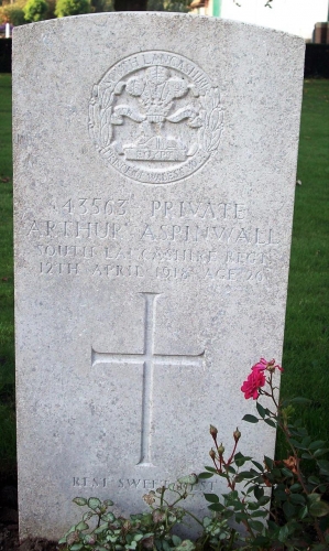 Arthur Aspinwall was born on 07th November 1892 at Greenleaf Street, Toxteth to Warrington born Joiner Arthur Quirk Aspinwall and his Liverpool born wife Mary Jane (nee Burtonwood).They married 25 Dec 1892 at St Peter's Church Liverpool they had 7 children of whom sadly 3 died pre 1911.Arthur was their 5th child.He was Baptised at St Peter's Church on 23 January 1893.