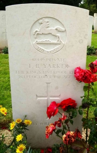 YARKER - In loving birthday remembrance of my dear husband Private THOMAS B. YARKER, 4th K.L.R., who died of wounds received in action October 26, 1918 and was buried at Awoingt Cemetery, east of Cambrai.