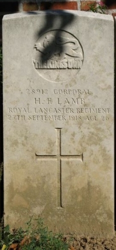 “September 27, killed in action, Corporal H. F. Lamb, aged 26 years, dearly-beloved son of J. W. Lamb, 91 Moscow Drive, Stoneycroft.”