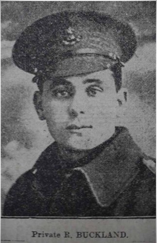 "Private R.Buckland,of the King's Liverpools, has been reported wounded and missing. He joined this regiment in January, 1915, and went to France in November last. Previously he was employed on the White Star Line on the S.S. Canada. Any information with regard to his whereabouts will be gladly received by his mother at 11, Woodville-road, Birkenhead".