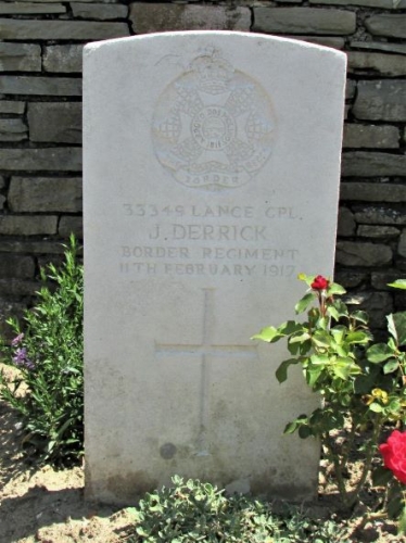 Puisieux village was captured by British troops on the 28th February 1917, lost on the 26th March 1918 and recovered on the following 21st August. Ten Tree Alley was made by the V Corps (as Ten Tree Alley Cemetery No.2, V Corps Cemetery No.24) in 1917 and it stood beside a former German trench, captured by the 32nd Division on the night of the 10th-11th February 1917. There are now nearly 70, 1914-18 war casualties commemorated in this site. Of these, over 20 are unidentified. The Cemetery covers an area of 250 square metres, without the access path and is enclosed by a rubble wall.