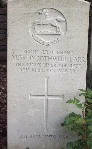 CARR - Killed in action on the 9th inst., Second-Lieutenant Alfred Rothwell Carr, King's (Liverpool Regiment), aged 29, dearly-beloved and youngest son of Mr and Mrs John Lindley Carr or Timperley, Cheshire.
