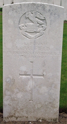 “June 13, from wounds received in action the same day, Private John Caulfield, the devoted and only son of Mary Caulfield, 23 Thurston Road, Anfield (late of Crown Street). (One of the best.) R.I.P. (Sadly missed by his loving mother.)”
