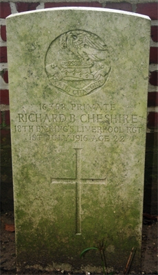 Dick was initially buried in Vernon Street Cemetery, Carnoy, his remains were lost probably through enemy shelling. He is now commemorated on the memorial in Dantzig Alley Cemetery British Cemetery, France.