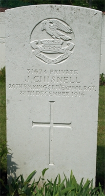 John was born on the 08th January 1890 one of triplets born to James Chisnell and his wife Mary Jane (nee Jackson) who had married in St Mary's Church in Kirkdale on 24th October 1886. His fellow triplets were his brothers James and Robert.
