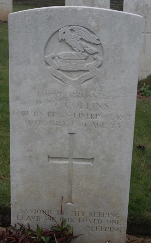 “In loving memory of Private Percy W. Collins, 1st Liverpool Pals, killed in action July 30, 1916, aged 23 years, the beloved and youngest son of Elizabeth and the late William I. Collins. – Sadly missed by Mother, Ruby, and Eddy (in France), of 18, Rhiwlas Street, Prince’s Park.”
