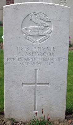 Private George Ashbrook of the King's (Liverpool) Regiment whose home is at 8 Admiral Street, Howley, was killed in action on the 23rd June. Private Ashbrook was a native of Northwich, but came to Warrington as a as a youth, and worked for Messrs. Dolan Brothers as a bricksetter's labourer. He joined the army shortly after the outbreak of war, and had been wounded twice. His wife died in the early part of this year and he leaves six children, of whom the eldest a boy of 18, already in training for active service.