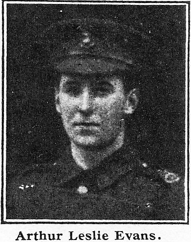 It is with extreme regret that we make the sad announcement that the borough of Flint has been deprived by the death of another of its soldier heroes upon the battlefield. On Monday Alderman J.W.M. Evans J.P. C.C., provision merchant, Flint, and residing at Pendre, Upper Church Street, received the communication in a letter and unofficially that his youngest son, Private Arthur Leslie Evans, had been wounded and further information was anxiously awaited. Another letter was to hand from the Liverpool District on Tuesday morning, corroborative of the information and stating that Private Evans had sustained wounds while pursuing his duties. He was conveyed as speedily as possible to a Dressing Station so that his injuries should have the necessary attention. Hopes were entertained by those who were with him that there would be a favourable turn in his condition, and Alderman Evans and his family we're also somewhat bouyed up; but early on Tuesday afternoon an official telegram arrived conveying the sad intelligence that Private Evans died on the following day. Deceased, who would have been 24 years of age on Monday next, was a native of Flint and had served a term of years with Messrs. J. Blythe and Sons, corn merchants, Bootle. He patriotically answered the call of his country and joined the Army and had been over two years at the front. He was home on leave from the front in February last. He was greatly respected by his soldier comrades, and beloved by all those who shared his acquaintance in his home surroundings. The sympathies of a large number of people of Flint are extended to Alderman Evans and Mrs Evans and the members of the family in there sad bereavement.